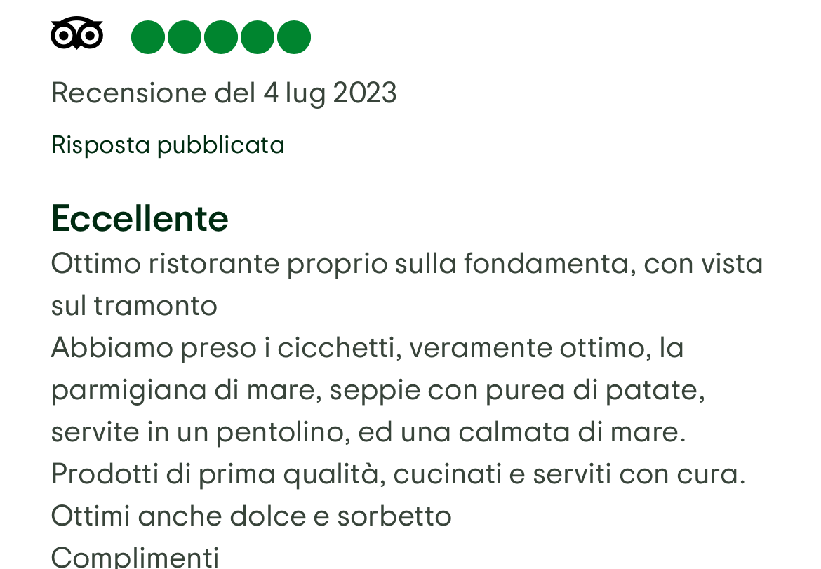 Una vasta selezione di piatti a base di pesce fresco, molluschi, ostriche e una location suggestiva affacciata sul canale, luogo ideale per gustare le specialità della cucina locale e trascorrere piacevoli serate in compagnia.